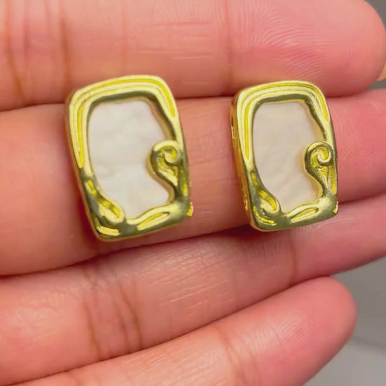 The Aurora Frame Studs by 10stone redefine modern chic with their sculpted design and soft glow. A smooth pearl-white base is encased within an abstract gold frame, creating a look that’s both artistic and refined.