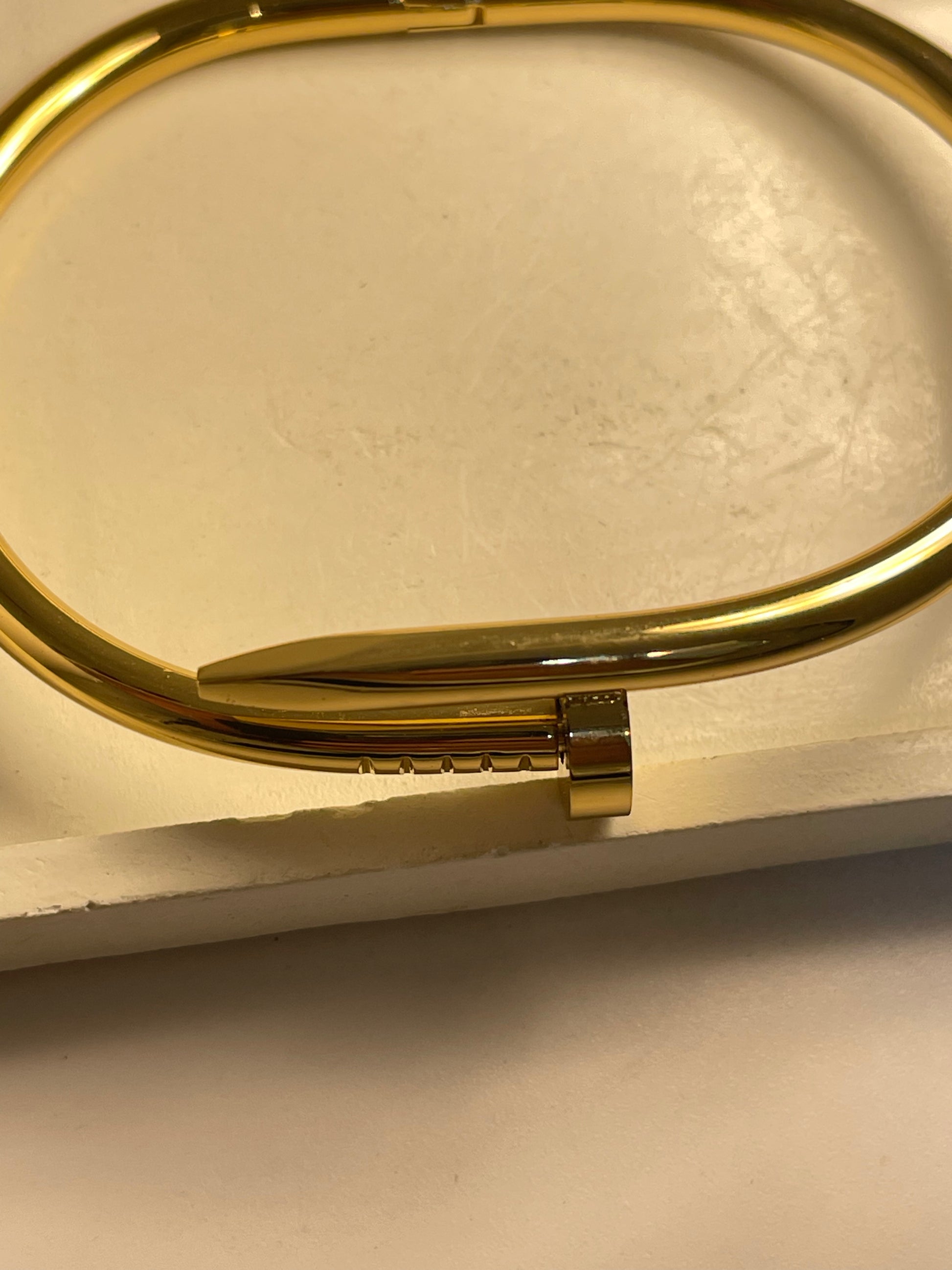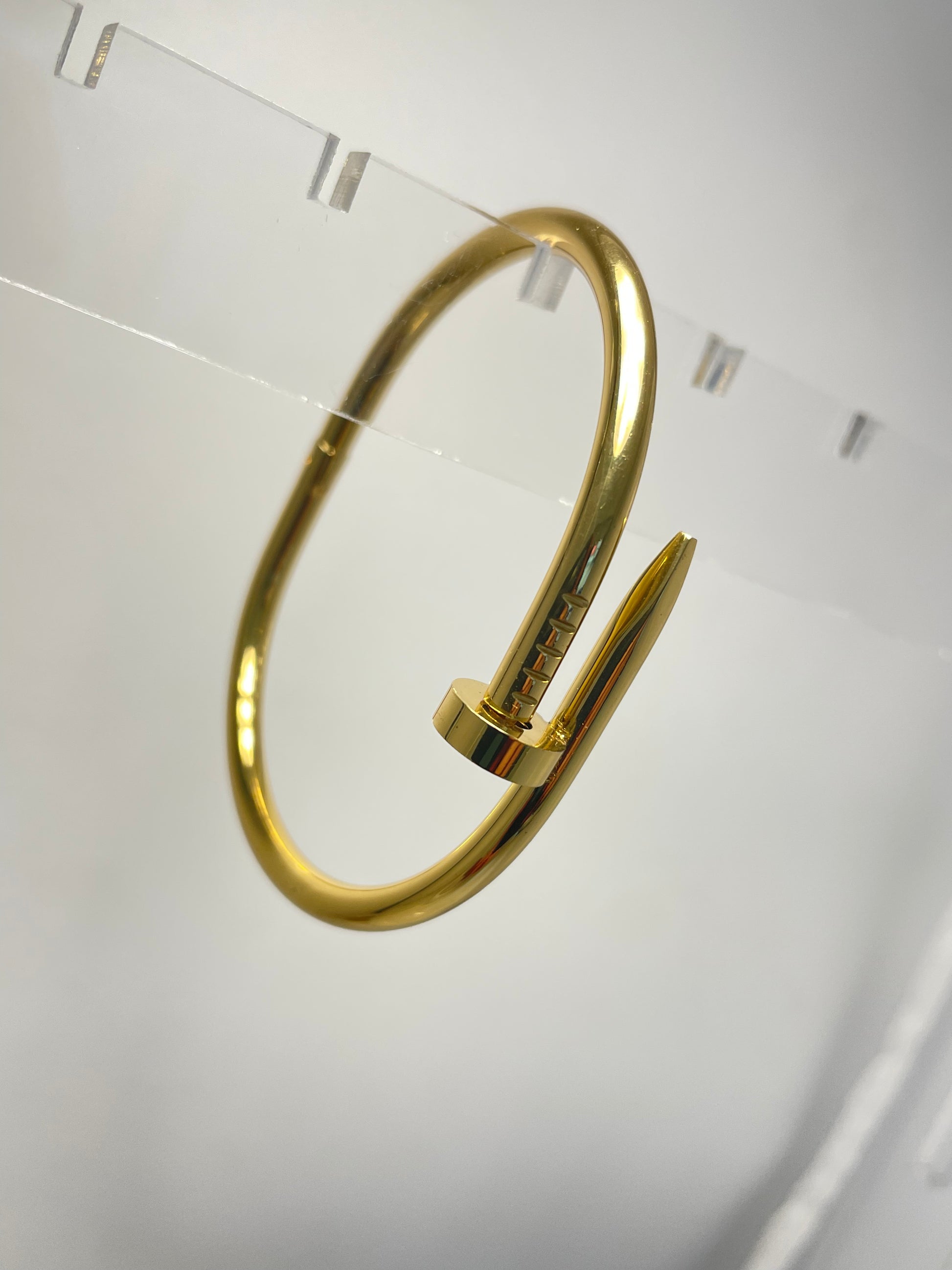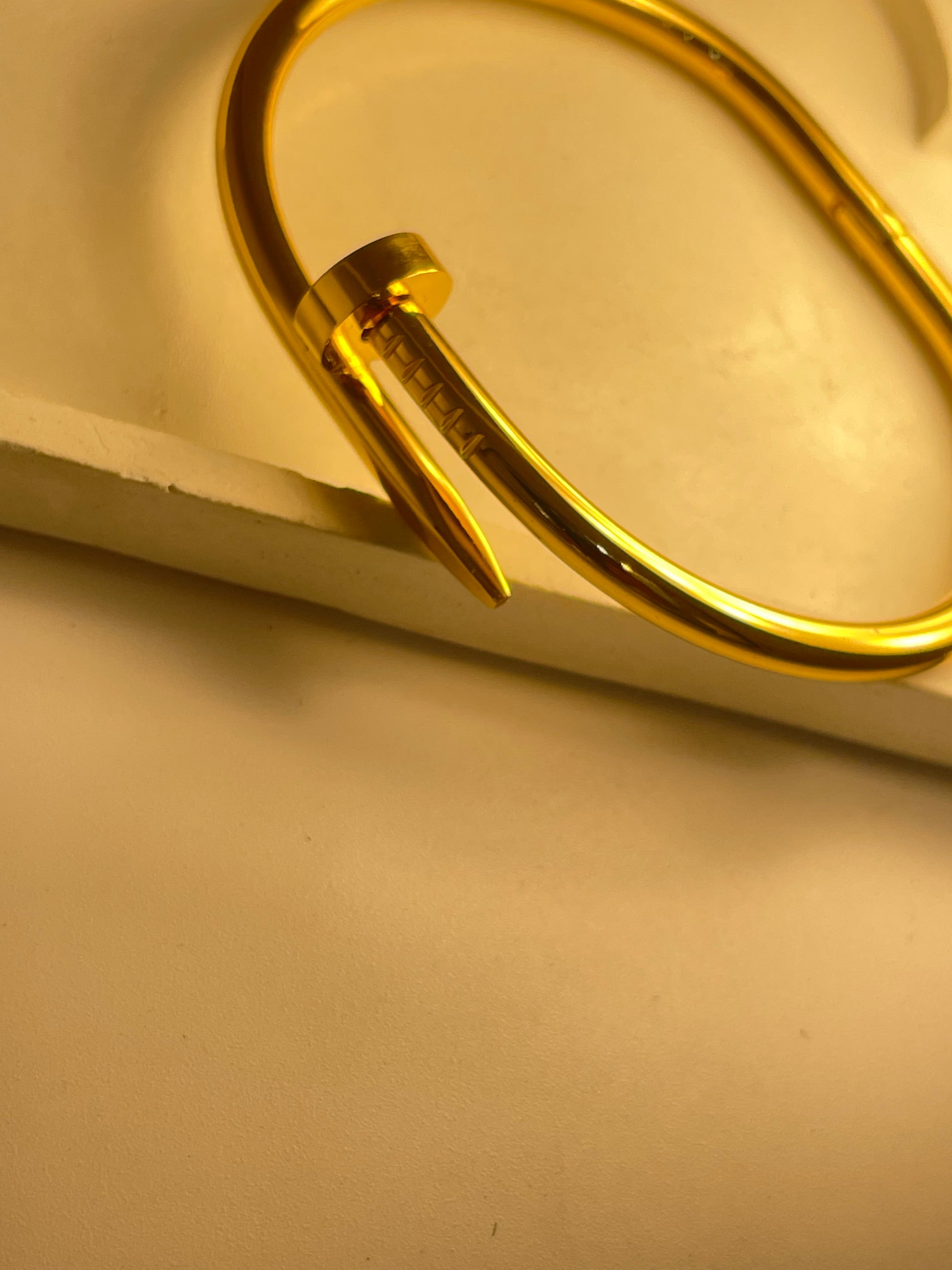 A bold expression of minimal elegance, our Nail Bracelet redefines sophistication with a modern twist. Crafted with precision, this statement piece features a sleek nail-inspired silhouette — symbolizing strength, style, and individuality. The radiant gold-plated finish adds a luxurious glow, making it the perfect companion for both everyday wear and evening glamour.