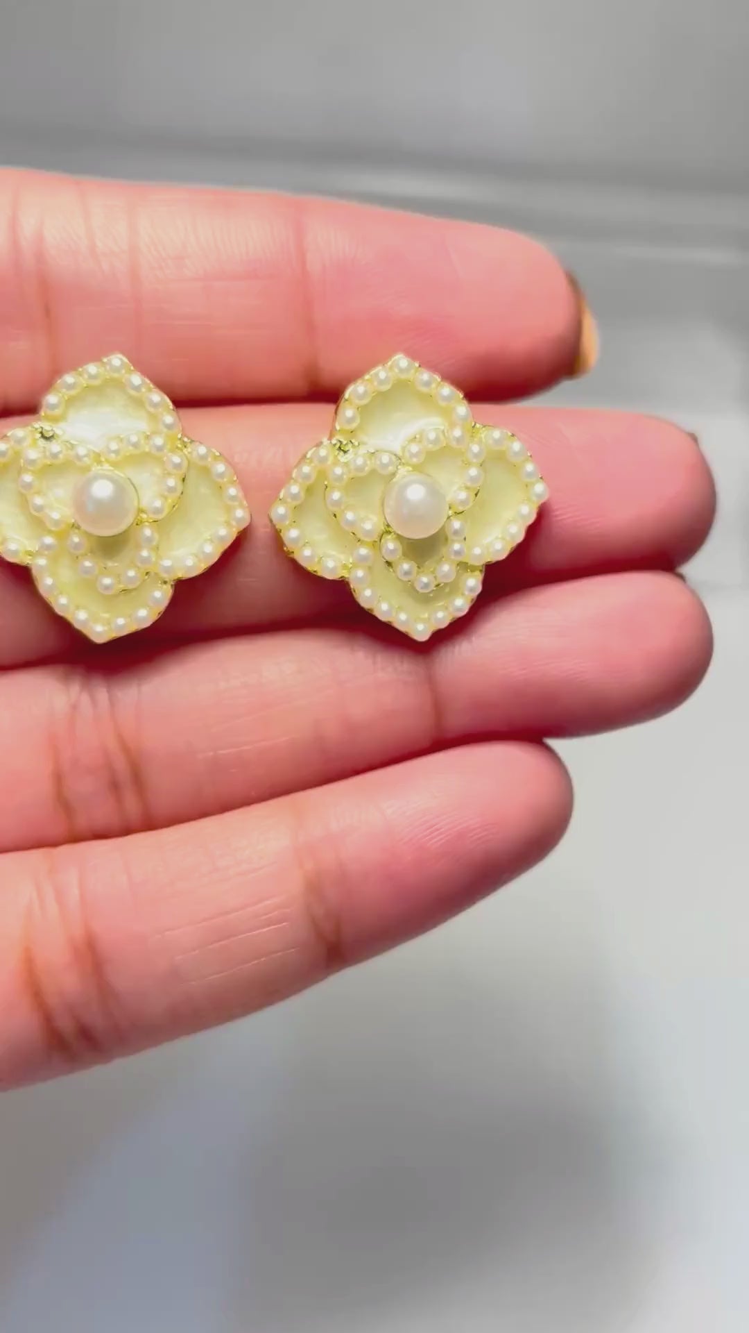 - Design: Multi-layered floral stud with mini pearl outline